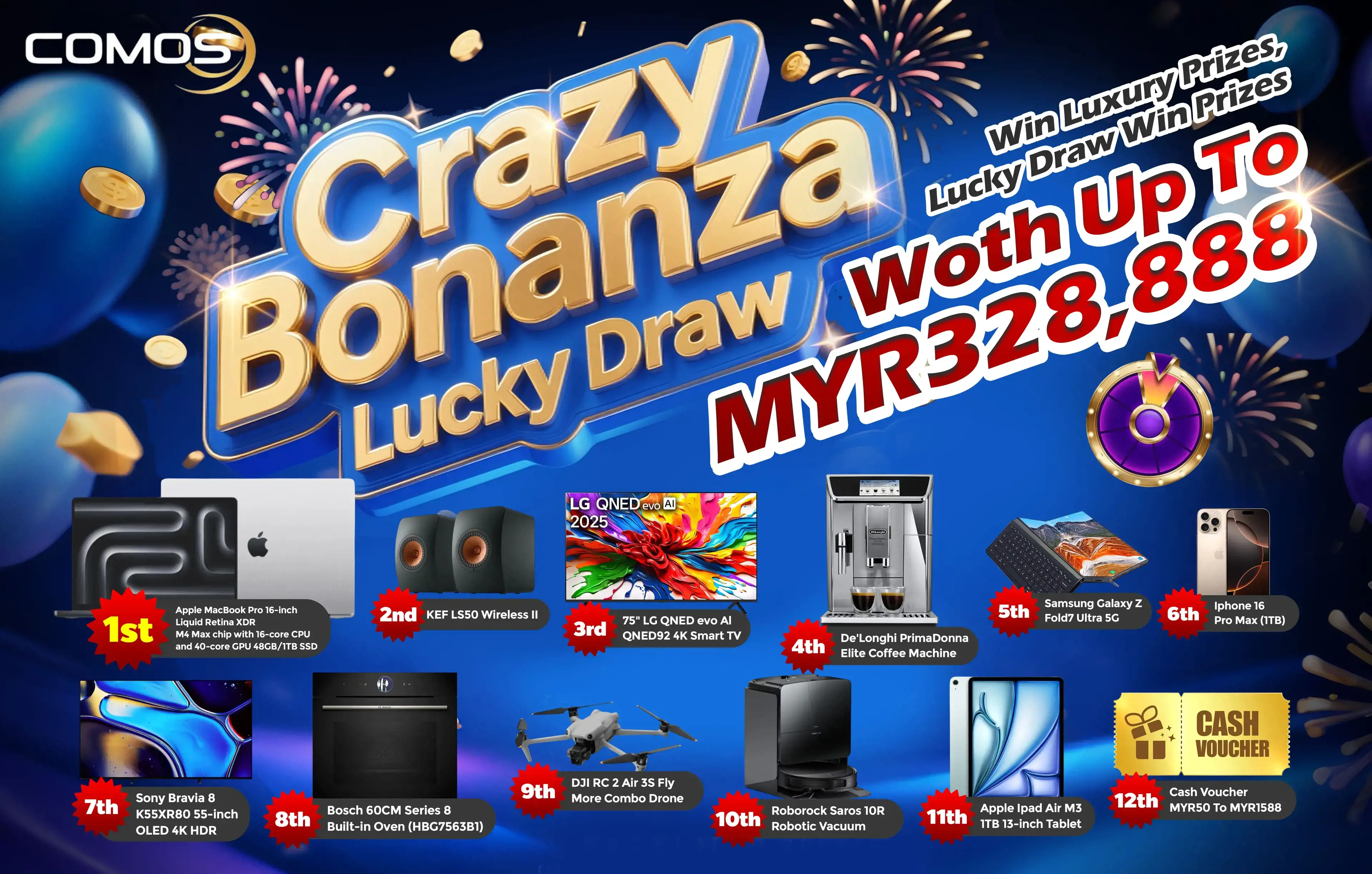 ● Above MYR95001 , You will receive more than Fifteen 15 Comos9 Crazy Bonaza Lucky Draw Coupon .